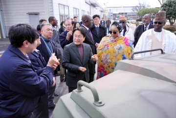 강기정 광주광역시장이 18일 오전 광산구 평동산단 자동차 전문 생산업체인 코비코㈜에서 열린 ‘나이지리아 경찰청 장갑차 수출 협약식’에 참석해 술레이만 이브라힘 아이만 나이지리아 경찰부장관, 조광철 코비코㈜ 대표 등과 차량을 살펴보고 있다./광주광역시 제공