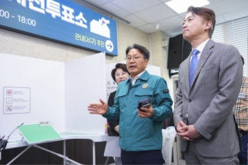 강기정 광주광역시장은 28일 서구 동천동행정복지센터를 찾아 투표소 설치상황과 접근성 확보 등을 집중 점검했다. 이날 현장점검에는 김이강 서구청장도 함께 했다.