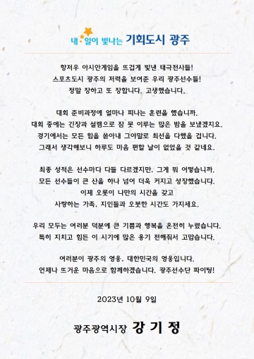 강기정 광주광역시장이 2022 항저우 아시안게임에서 열전을 펼친 22명의 선수와 임원진 등 광주시 소속 선수단에 9일 축하 메시지를 보냈다.